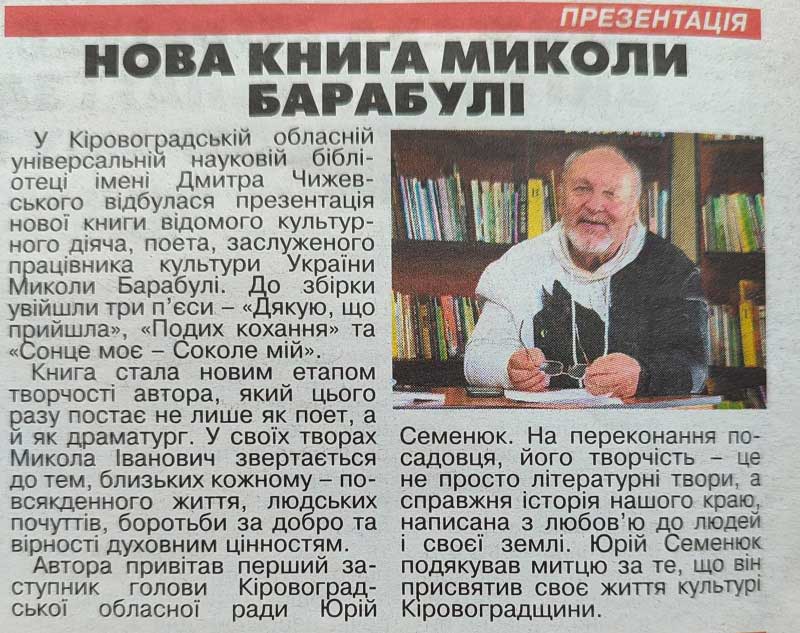 У Кіровоградській обласній універсальній науковій бібліотеці імені Дмитра Чижевського відбулася презентація нової книги відомого культурного діяча, поета, заслуженого працівника культури України Миколи Барабулі.