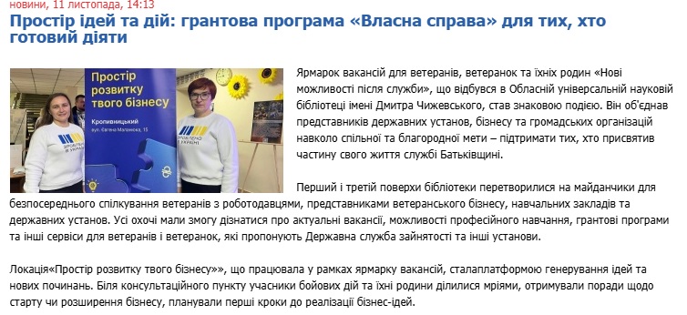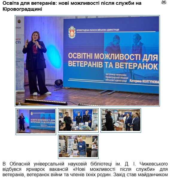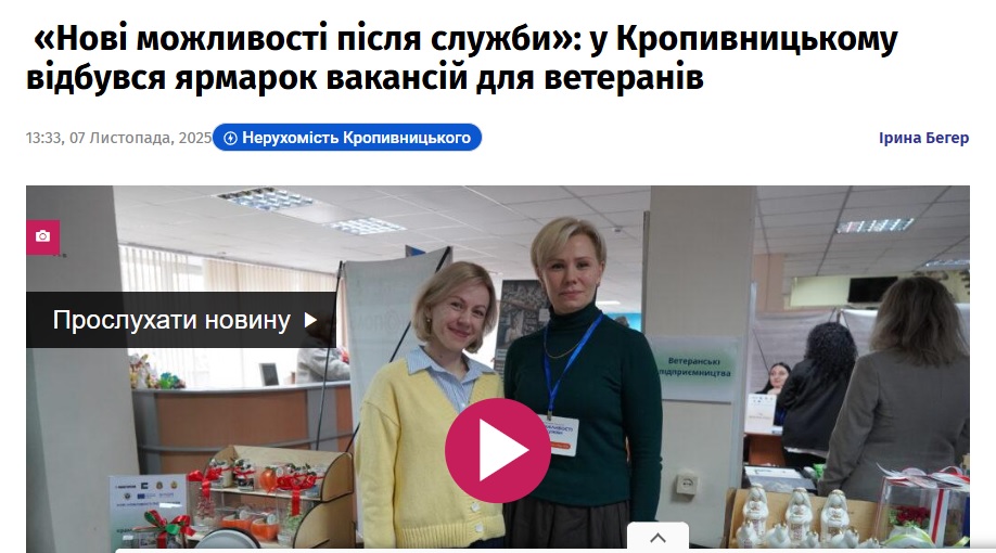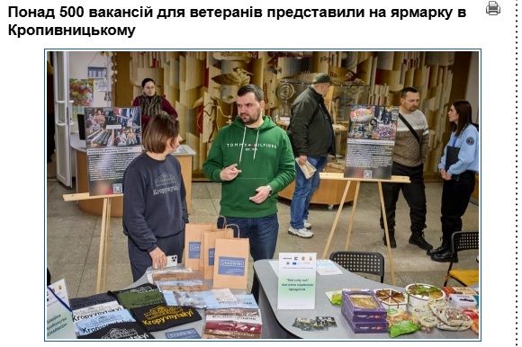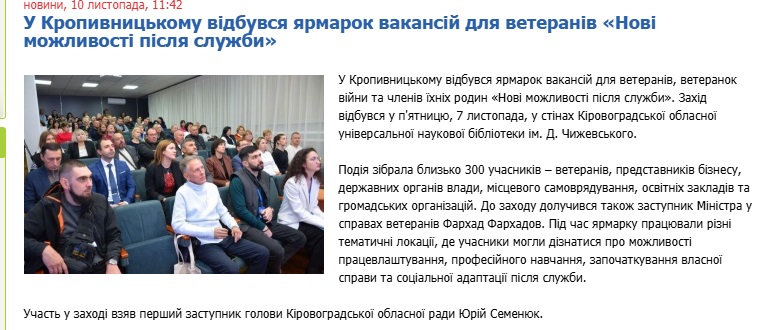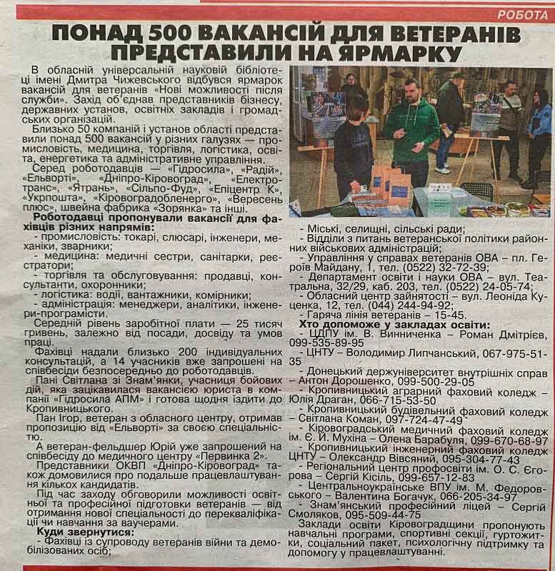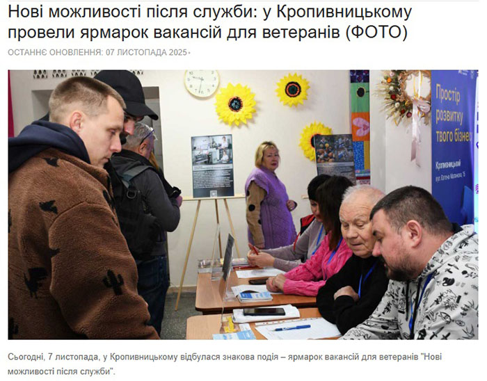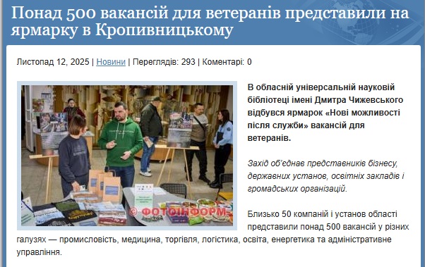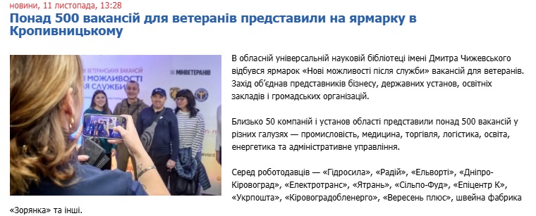 Понад 500 вакансій для ветеранів представили на ярмарку в Кропивницькому// Фотоінформ. – https://www.fotoinform.net/news/novosti-na-ukrainskom-yazike/ponad-500-vakansiy-dlya-veteraniv-predstavili-na-yarmarku-v-kropivnitskomu.html. – Дата публікації 12.11.2025.