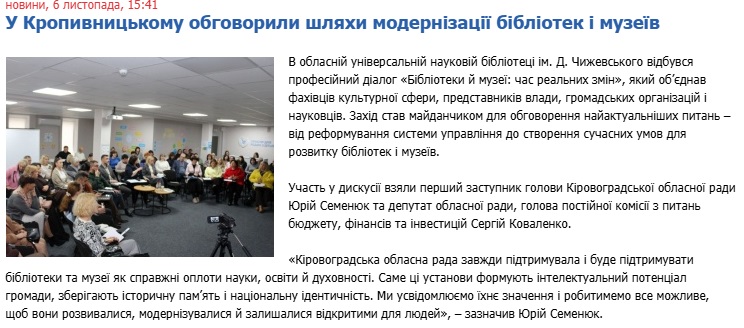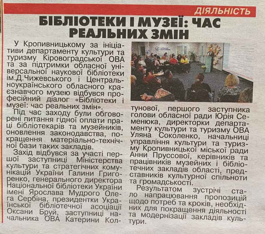 ОУНБ ім. Д.І. Чижевського стала майданчиком для професійного діалогу «Бібліотеки і музеї: час реальних змін». Захід відбувся за ініціативи департаменту культури та туризму Кіровоградської ОВА за підтримки обласної книгозбірні та Центральноукраїнського обласного краєзнавчого музею.