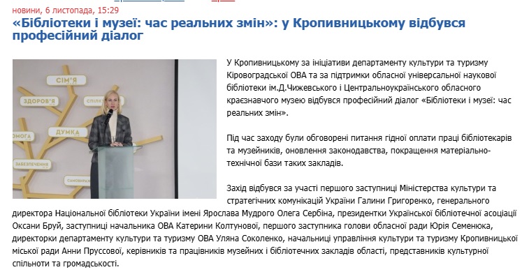 Бібліотеки і музеї: час реальних змін // 21-й канал. – 2025. – 13 листопада. – С. 5 : фото.кол.