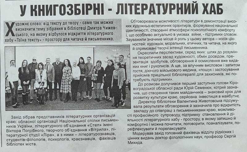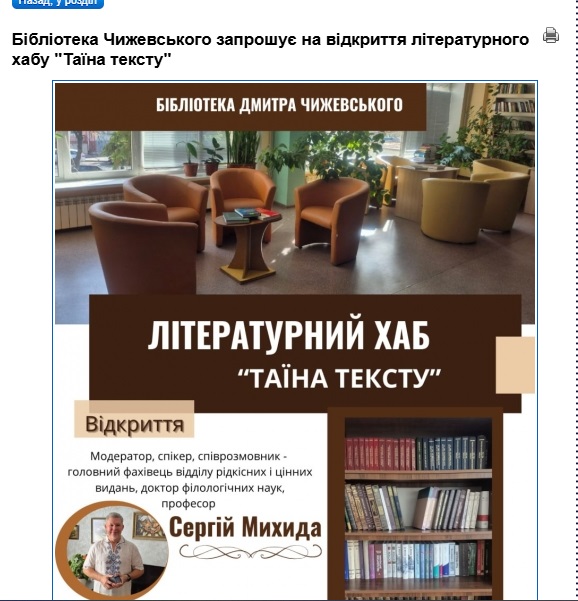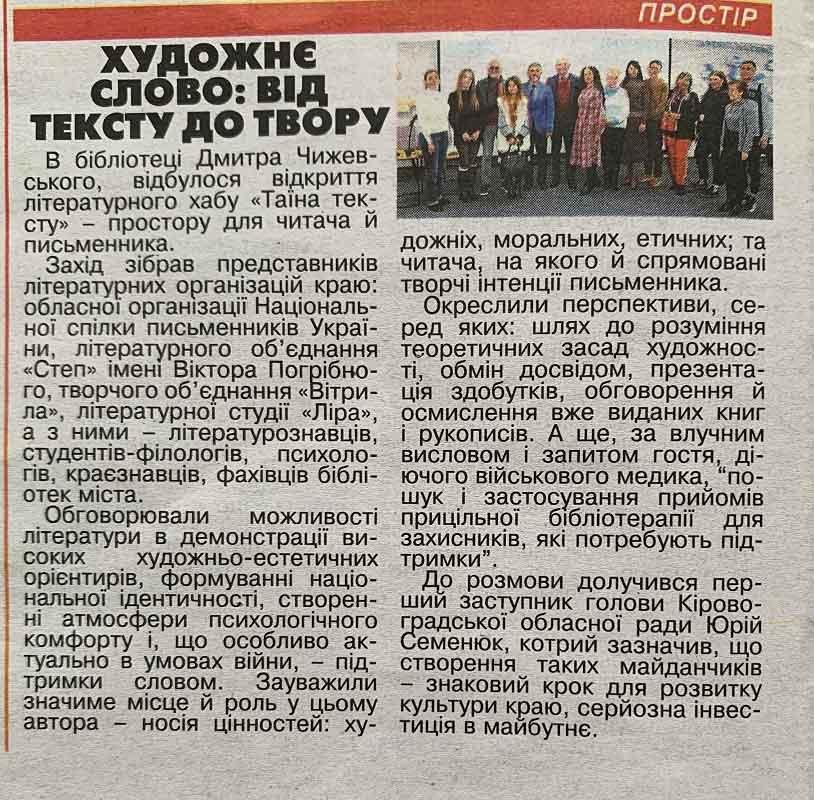 В Обласній науковій бібліотеці імені Дмитра Чижевського відбулося відкриття літературного хабу «Таїна тексту» – простору для читача й письменника.