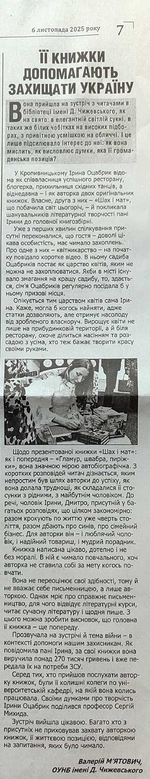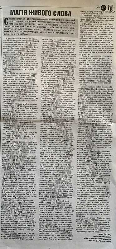 Рєзнік Ірина. Магія живого слова / Ірина Рєзнік // Народне слово. – 2025. – 13 листопада. – С. 8.