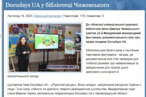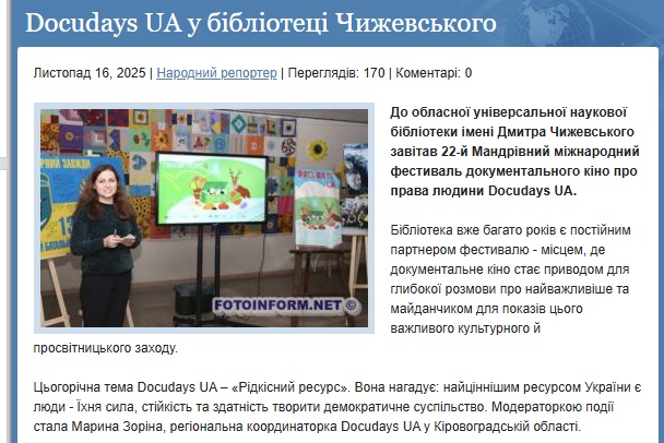 Docudays UA у бібліотеці Чижевського // Фотоінформ. – Режим доступу: https://www.fotoinform.net/news/narodniy-reporter/docudays-ua-u-bibliotetsi-chizhevskogo.html. – Дата публікації: 16.11.2025.