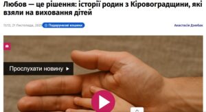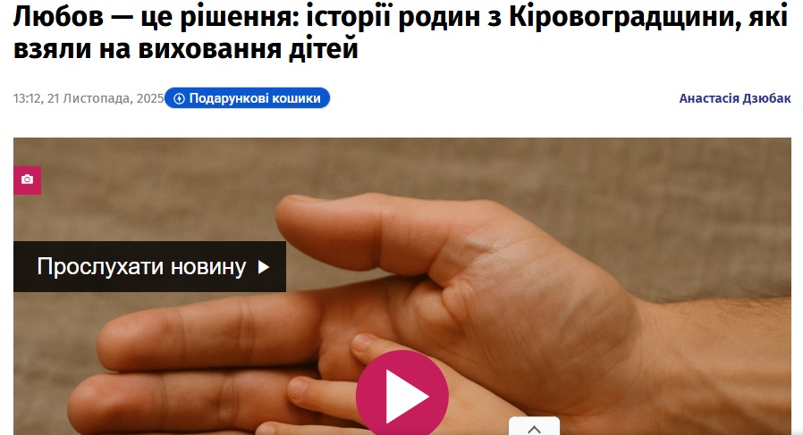 Любов — це рішення: історії родин з Кіровоградщини, які взяли на виховання дітей // Гречка. – Режим доступу: https://gre4ka.info/suspilstvo/lyubov-cze-rishennya-istoriyi-rodyny-z-kirovogradshhyny-yaki-vzyaly-na-vyhovannya-ditej/. – Дата публікації: 21.11.2025.