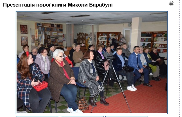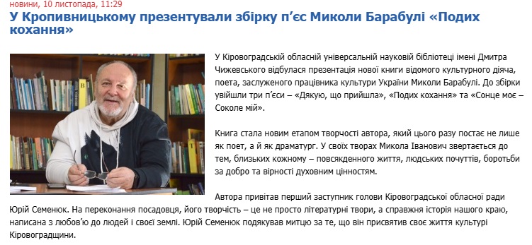 В Кіровоградській обласній універсальній науковій бібліотеці імені Д.І.Чижевського відбулася презентація нової книги відомого культурного діяча, поета, заслуженого працівника культури України Миколи Барабулі.