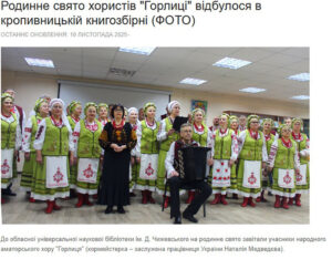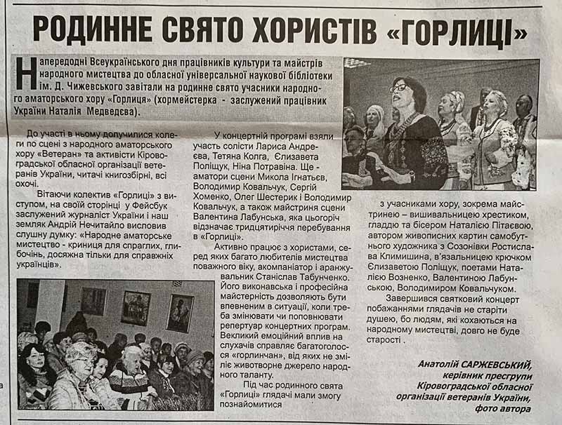 Саржевський Анатолій. Родинне свято хористів «Горлиці» / Анатолій Саржевський // Народне слово. – 2025. – 13 листопада. – С. 6 : фото.