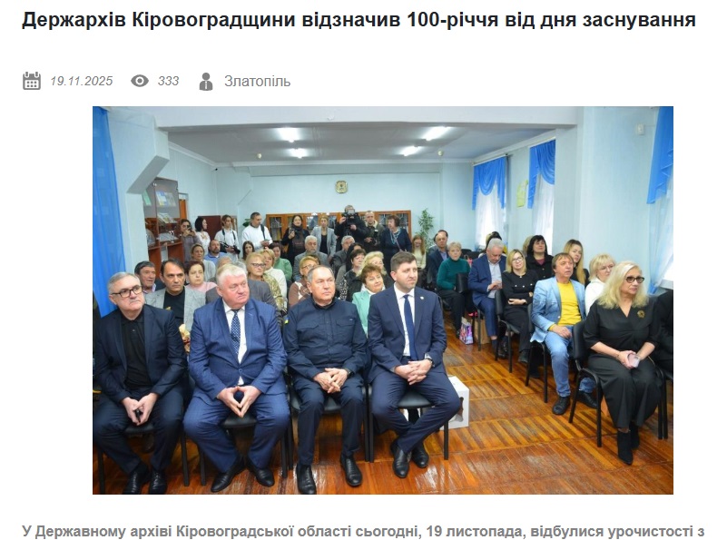 Держархів Кіровоградщини відзначив 100-річчя від дня заснування // Златопіль. – Режим доступу: https://zlatopil.com/all-news/derzharhiv-kirovogradshhyny-vidznachyv-100-richchya-vid-dnya-zasnuvannya. – Дата публікації: 19.11.2025.