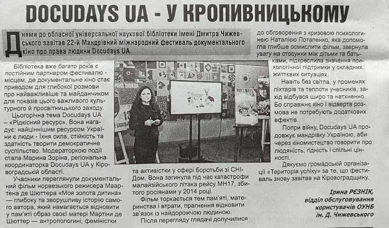 Рєзнік Ірина. Docudays UA – у Кропивницькому / Ірина Рєзнік // Народне слово. – 2025. – 20 листопада. – С. 2 : фото