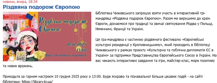 Різдвяна подорож Європою // Кіровоград 24. – Режим доступу: https://kirovograd24.com/shortly/2025/12/08/rizdvjana-podorozh-evropoju.htm. – Дата публікації: 08.12.2025.