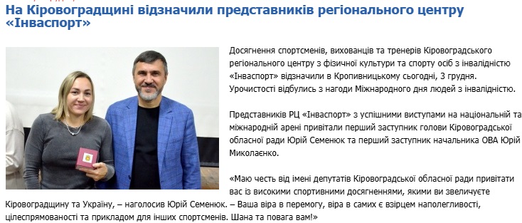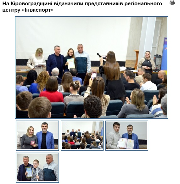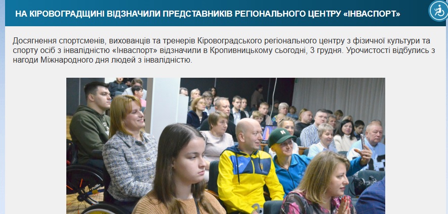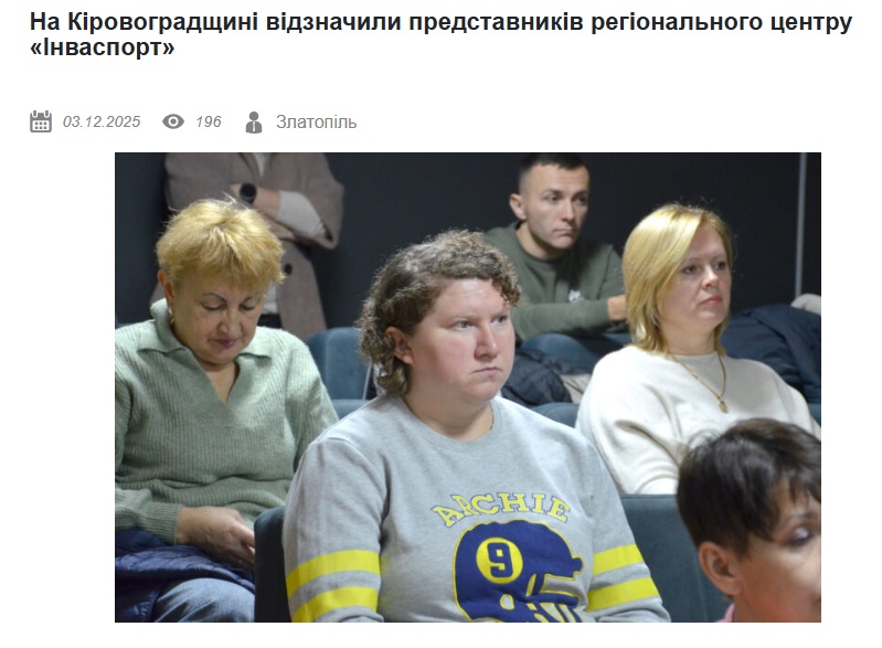 На Кіровоградщині відзначили представників регіонального центру «Інваспорт» // Кіровоградська обласна рада. – Режим доступу: https://oblrada.kr.ua/event/031220251548. – Дата публікації: 03.12.2025.