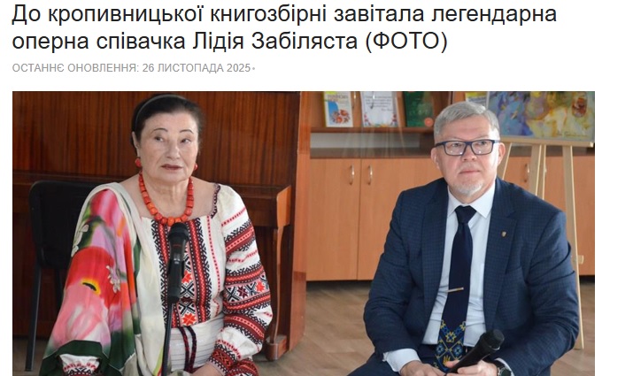 До кропивницької книгозбірні завітала легендарна оперна співачка Лідія Забіляста (ФОТО) // З перших уст. – Режим доступу: https://zpu.kr.ua/kultura/35137-do-kropyvnytskoi-knyhozbirni-zavitala-lehendarna-operna-spivachka-lidiia-zabiliasta-foto. – Дата публікації: 26.11.2025.