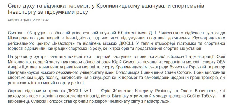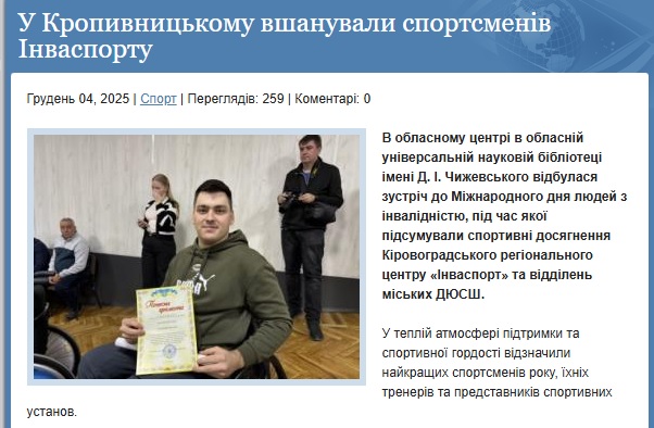 У Кропивницькому вшанували спортсменів Інваспорту // Фотоінформ. – Режим доступу: https://www.fotoinform.net/news/sport/u-kropivnitskomu-vshanuvali-sportsmeniv-invasportu.html. – Дата публікації: 04.12.2025.