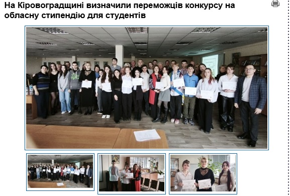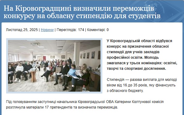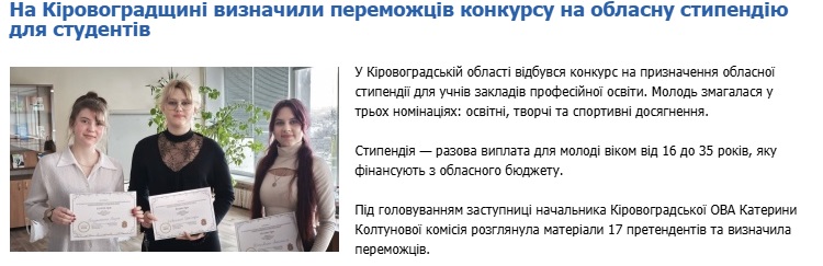 На Кіровоградщині визначили переможців конкурсу на обласну стипендію для студентів // Фотоінформ. – Режим доступу: https://www.fotoinform.net/?page=8. – Дата публікації: 25.11.2025.