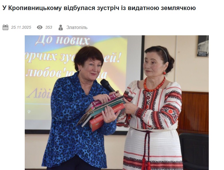 У Кропивницькому відбулася зустріч із видатною землячкою // Златопіль. – Режим доступу: https://zlatopil.com/all-news/u-kropyvnytskomu-vidbulasya-zustrich-iz-vydatnoyu-zemlyachkoyu. – Дата публікації: 25.11.2025.