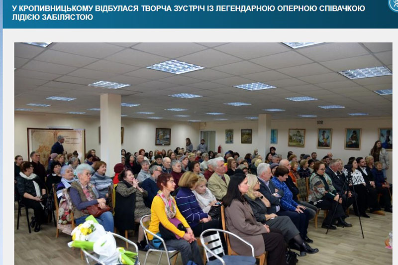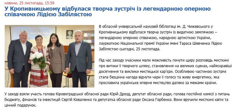 В обласній універсальній науковій бібліотеці ім. Д. Чижевського у Кропивницькому відбулася творча зустріч із видатною землячкою – легендарною оперною співачкою, народною артисткою України, лауреаткою Національної премії України імені Тараса Шевченка Лідією Забілястою сьогодні, 25 листопада.