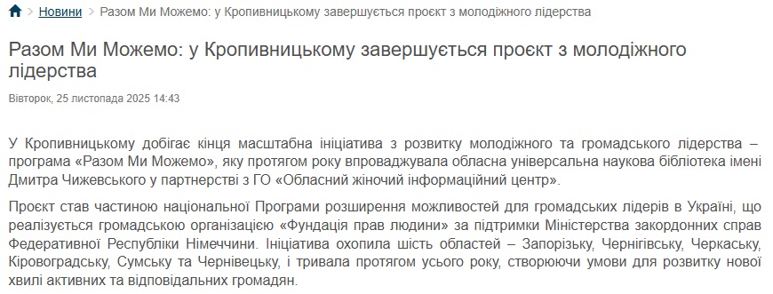 Разом Ми Можемо: у Кропивницькому завершується проєкт з молодіжного лідерства // Кропивницька міська рада. – Режим доступу: https://kr-rada.gov.ua/news/razom-mi-mozhemo-u-kropivnitskomu-zavershutsya-prokt-z-molodizhnogo-liderstva_25-11-2025.html. – Дата публікації: 25.11.2025.