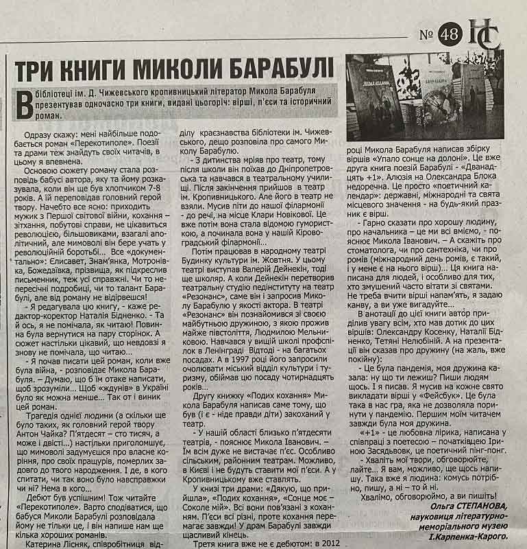 Презентація нової книги Миколи Барабулі // 21-ий канал. – Режим доступу: https://21ch.kr.ua/posts/index/view/name/prezentatsija-novoji-knigi-mikoli-barabuli-1763027384. – Дата публікації: 13.11.2025.