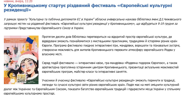 У рамках проєкту “Культурна та публічна дипломатія ЄС в Україні” обласна універсальна наукова бібліотека імені Д.І.Чижевського запрошує містян на різдвяний фестиваль «Європейські культурні резиденції у Кропивницькому», що відбудеться 9-19 грудня за підтримки Представництва Європейського Союзу в Україні.