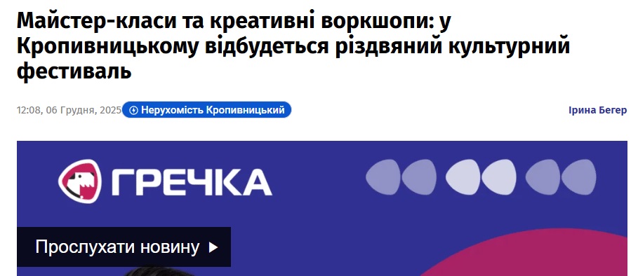 Майстер-класи та креативні воркшопи: у Кропивницькому відбудеться різдвяний культурний фестиваль // Гречка. – Режим доступу: https://gre4ka.info/anonsy/majster-klasy-ta-kreatyvni-vorkshopy-u-kropyvnyczkomu-vidbudetsya-rizdvyanyj-kulturnyj-festyval/. – Дата публікації: 06.12.2025.