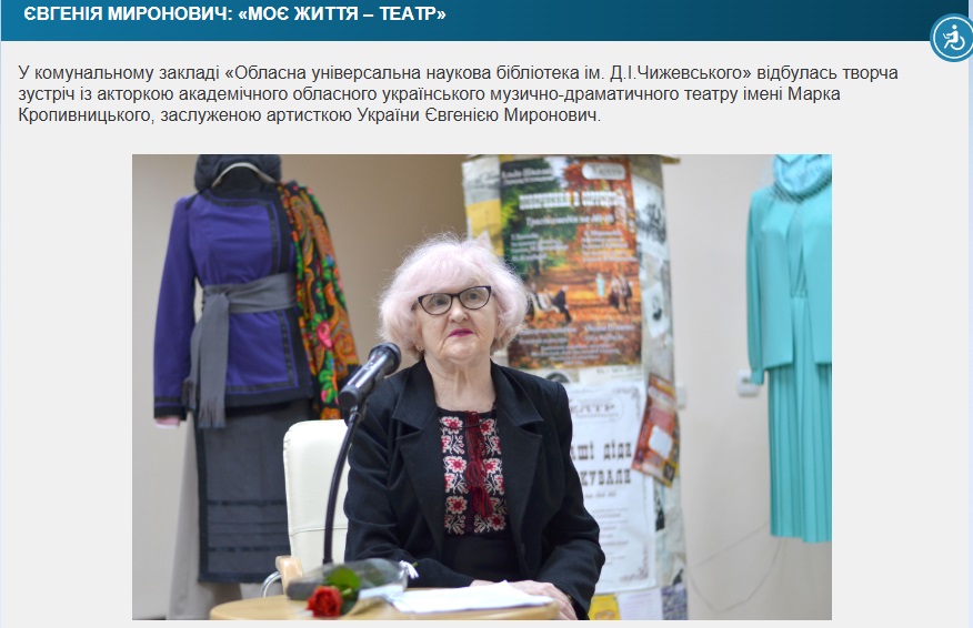 У комунальному закладі «Обласна універсальна наукова бібліотека ім. Д.І.Чижевського» відбулась творча зустріч із акторкою академічного обласного українського музично-драматичного театру імені Марка Кропивницького, заслуженою артисткою України Євгенією Миронович.
