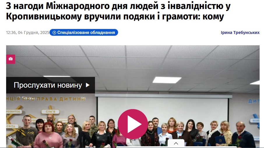У Кропивницькому відбулися урочистості до Міжнародного дня людей з інвалідністю // 21-ий канал. – Режим доступу: https://21ch.kr.ua/posts/index/view/name/-1764832496. – Дата публікації: 04.12.2025.