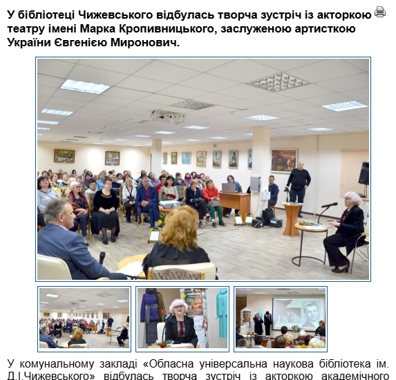 У книгозбiрнi iменi Д.I.Чижевського» вiдбулась творча зустрiч iз акторкою Театру Корифеїв, заслуженою артисткою України Євгенiєю Миронович.