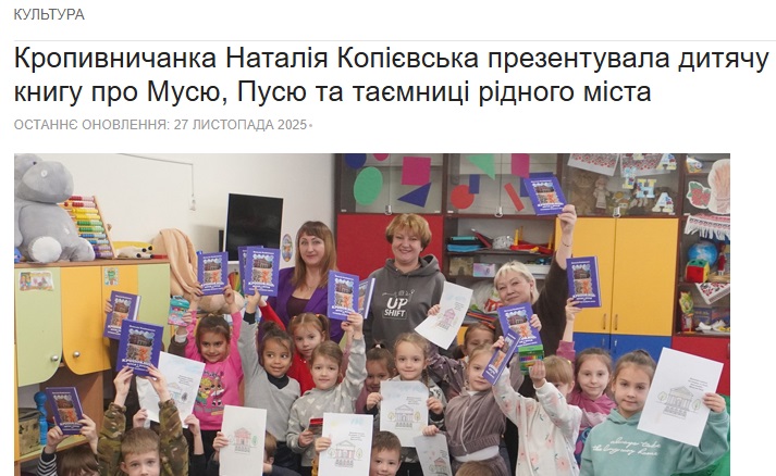 Кропивничанка Наталія Копієвська презентувала дитячу книгу про Мусю, Пусю та таємниці рідного міста // З перших уст. – Режим доступу: https://zpu.kr.ua/kultura/35108-kropyvnychanka-nataliia-kopiievska-prezentuvala-dytiachu-knyhu-pro-musiu-pusiu-ta-taiemnytsi-ridnoho-mista. – Дата публікації: 27.11.2025.