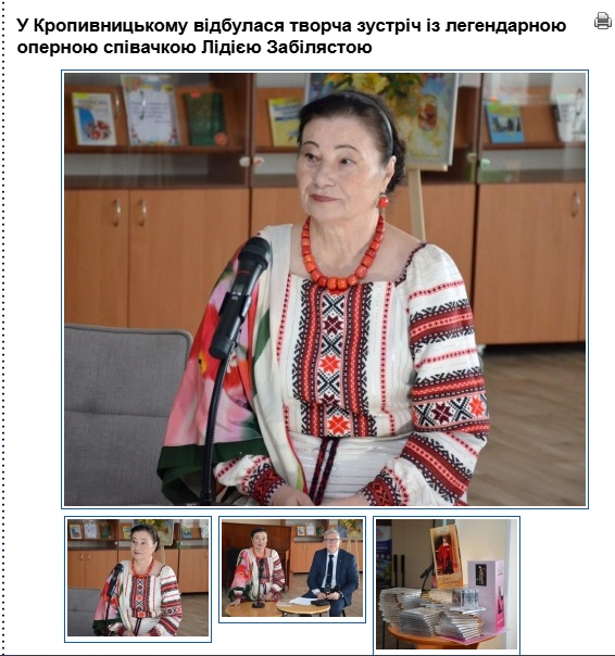 В обласній універсальній науковій бібліотеці ім. Д. Чижевського у Кропивницькому відбулася творча зустріч із видатною землячкою – легендарною оперною співачкою, народною артисткою України, лауреаткою Національної премії України імені Тараса Шевченка Лідією Забілястою.
