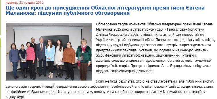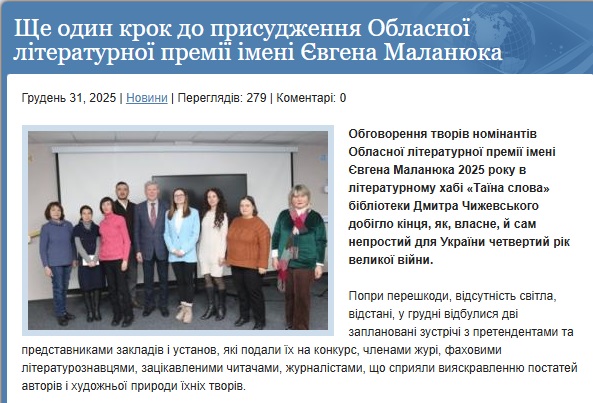 Ще один крок до присудження Обласної літературної премії імені Євгена Маланюка // Фотоінформ. – Режим доступу: https://www.fotoinform.net/news/novosti-na-ukrainskom-yazike/she-odin-krok-do-prisudzhennya-oblasnoyi-literaturnoyi-premiyi-imeni-vgena-malanyuka.html. – Дата публікації: 31.12.2025.