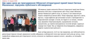 Триває обговорення літературних творів, висунутих на здобуття обласної премії імені Євгена Маланюка // Кіровоград 24. – Режим доступу: https://kirovograd24.com/shortly/2025/12/16/trivae-obgovorennja-literaturnih-tvoriv-visunutih-na-zdobuttja-oblasnoi-premii-imeni-evgena-malanjuka.htm. – Дата публікації: 16.12.2025.