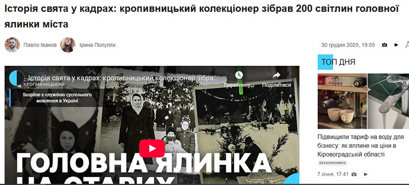 Історія свята у кадрах: кропивницький колекціонер зібрав 200 світлин головної ялинки міста // Суспільне. – Режим доступу: https://suspilne.media/kropyvnytskiy/1202230-istoria-svata-u-kadrah-kropivnickij-kolekcioner-zibrav-200-svitlin-golovnoi-alinki-mista/. – Дата публікації: 30.12.2025.